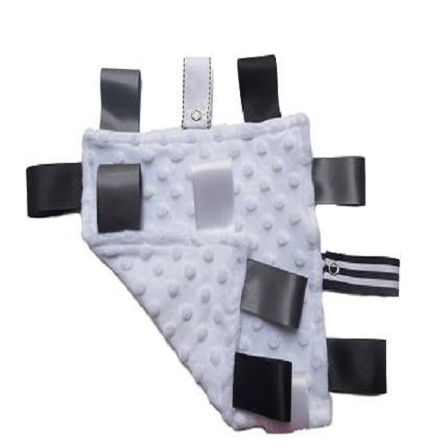 A security ribbon blanket can be your baby’s bestie . A blanket that provides not only comfort, but also entertainment. It can engage your little one, stimulating his/her senses and giving her/his cognitive development a jumpstart while keeping him/her cozy. And when your baby reaches and grabs for the ribbons, he/she’s also developing his/her fine motor skills, as well as his hand-eye coordination The pacifier snaps helps lessen the worry of a lost binky and the other can be attached to the car seat or stroller to avoid the tag from getting lost.